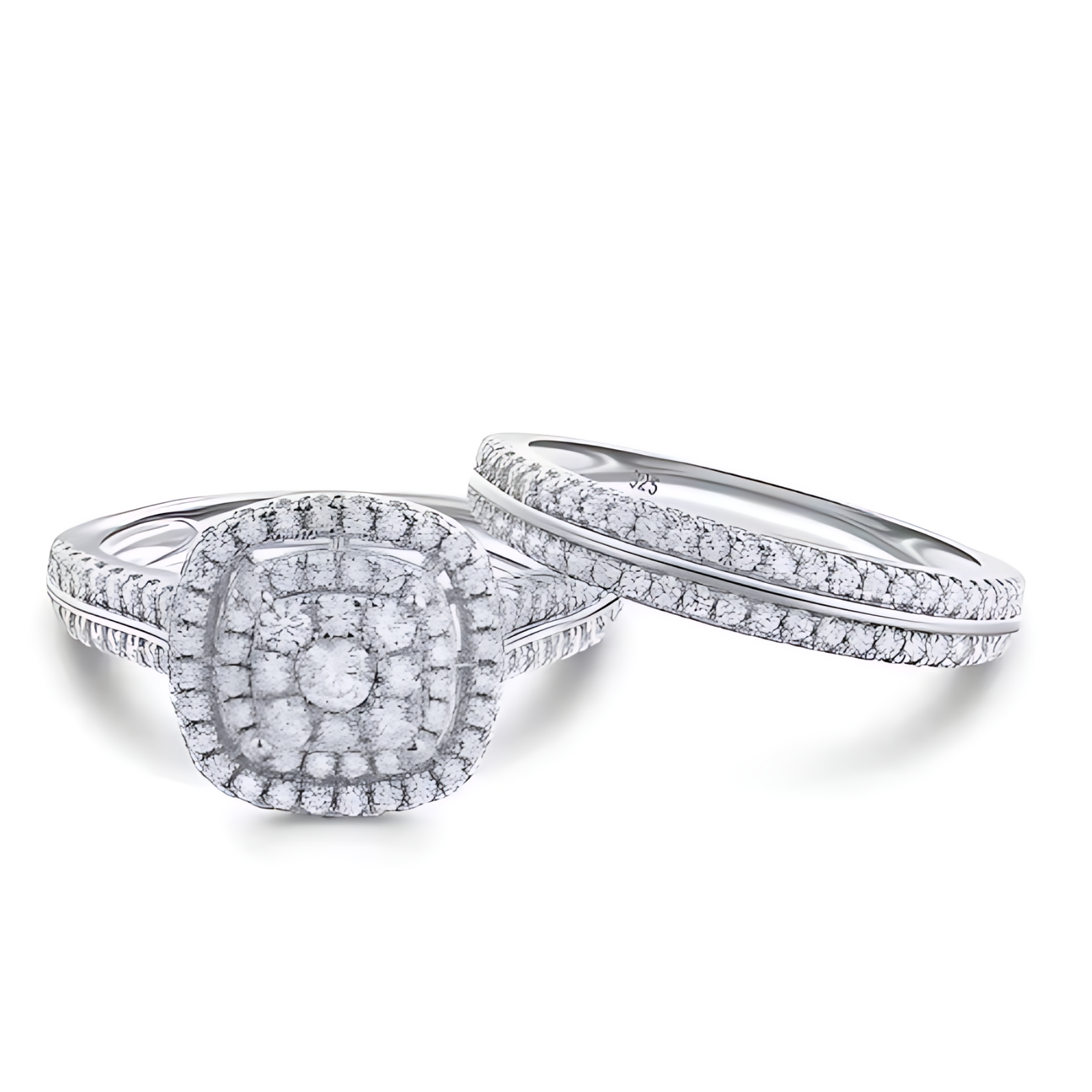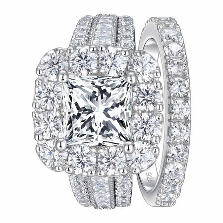 Women’s 2-Piece Halo Princess Cut Cubic Zircon Wedding Ring Set Sterling Silver Jewelry