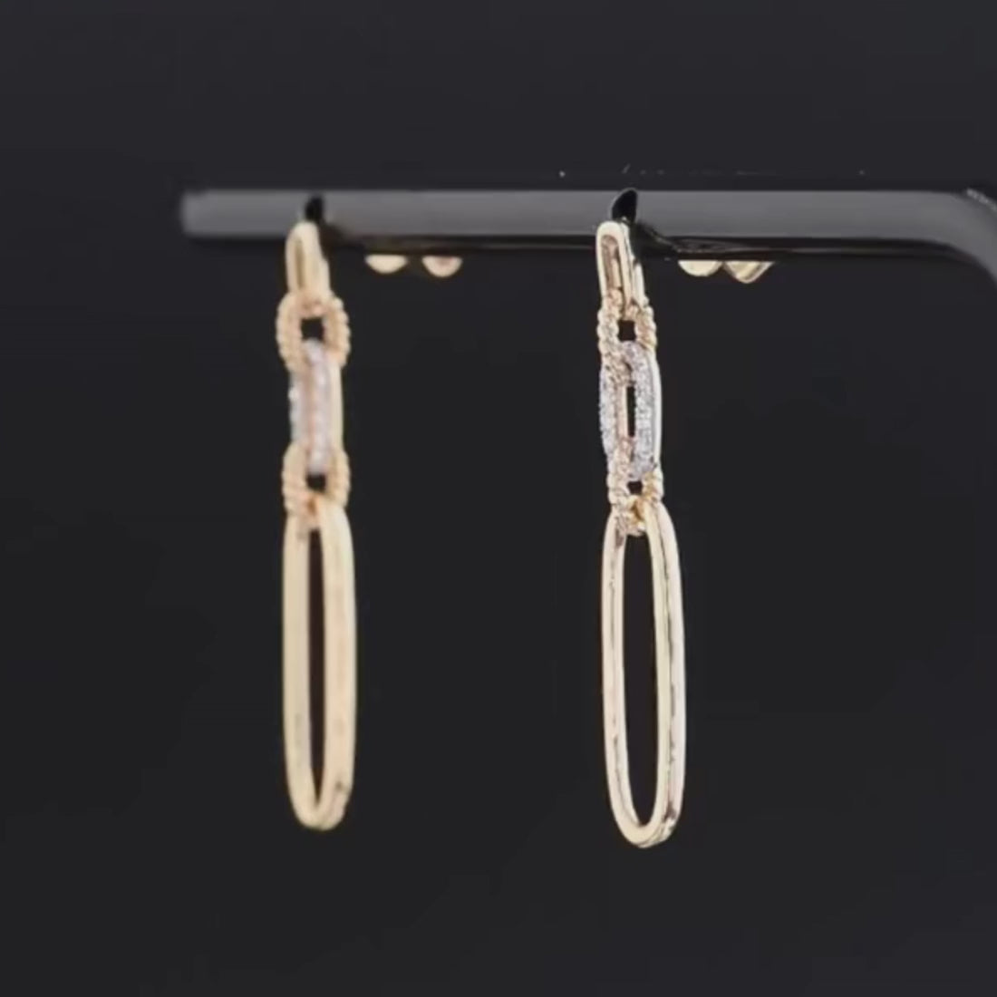 Elegantes y contemporáneos, estos pendientes colgantes presentan un diseño de cadena geométrica realzado con brillantes diamantes naturales. Fabricados en oro amarillo sólido 14K (AU585), combinan geometría moderna con lujo atemporal.