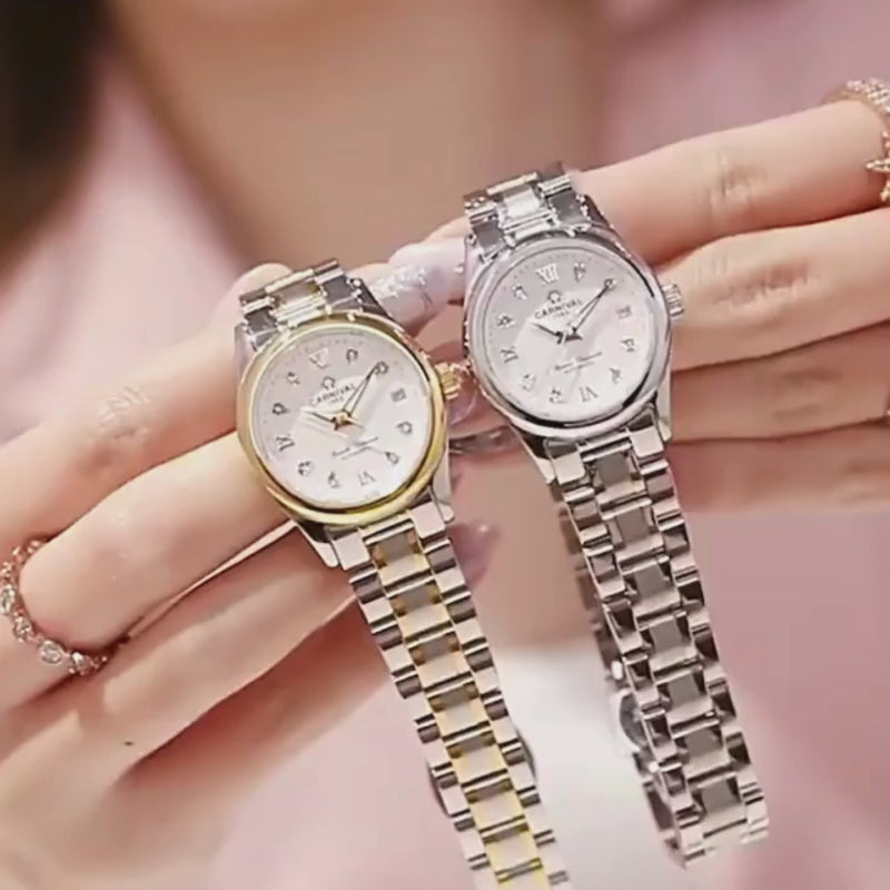 Celebrate timeless sophistication with this women’s luxury automatic watch featuring a polished 26mm stainless steel case and a sleek matching bracelet band. Designed with classic Roman numeral markers and a slim 11mm profile, this timepiece blends elegance and durability.