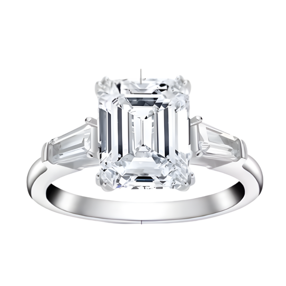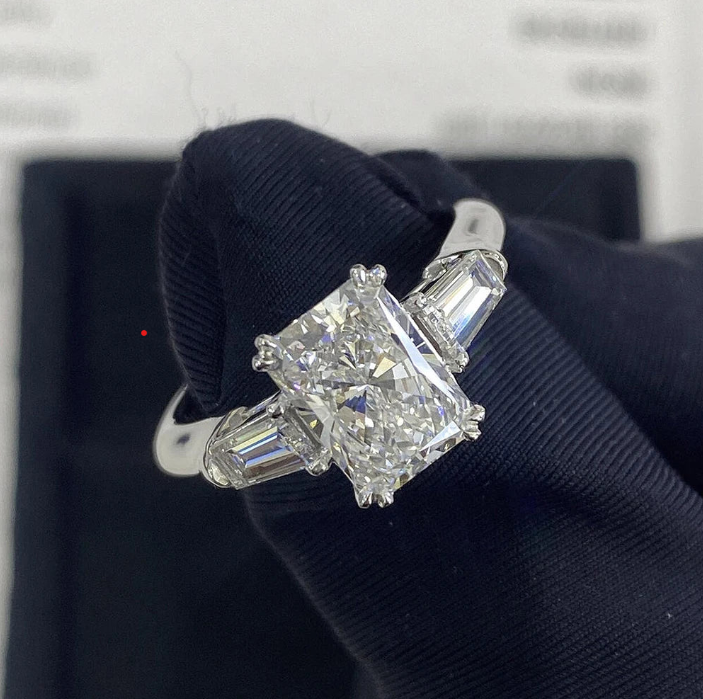 Main Stone: Moissanite — Radiant cut center with baguette side design