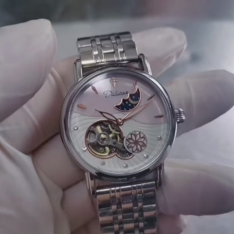 Unveil the beauty of celestial elegance with this watch — a luxury automatic watch made for women who love standout sophistication. Featuring a captivating moon phase complication, rotatable floral elements, and luminous hands, this timepiece is more than just functional — it’s a wrist statement.