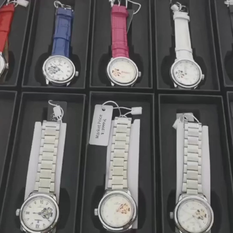 The self-winding movement, paired with a soft leather strap, creates a perfect harmony of style and engineering. With its Roman numeral markers, chronograph styling, and shock resistance, this timepiece makes an ideal gift for women who adore elegance, charm, and mechanical flair.