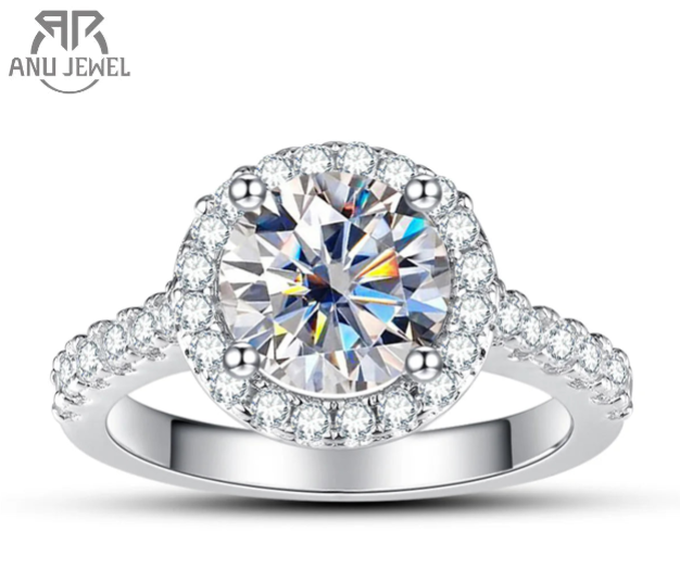 Women Moissanite Engagement Ring 2 Carat Round Halo Sterling Silver Wedding Anniversary Gift